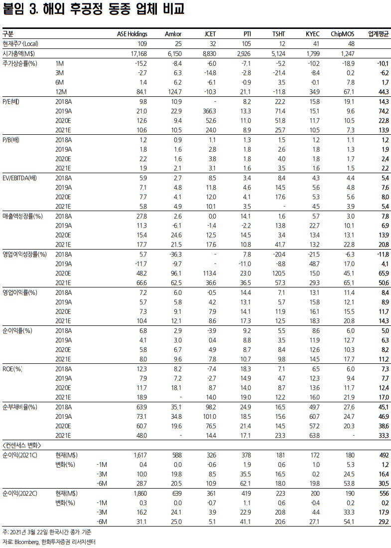 투자의견을 '긍정적(Positive)'로 제시하셨네요. 슈퍼사이클이 시작된다던 반도체 산업이 어느 순간 다운사이클로 불안을 야기하고 있습니다. 다행히 이번 다운사이클이 짧을 것이라 예상하시네요. 우리나라 반도체 수출 의존도가 높기에 앞으로 긍정적으로 다가왔으면 좋겠네요. 끝으로 반도체 대형주 최선호주로 삼성전자를 제시하고 중소형주로는 파운드리 후공정기업 위주로 하나마이크론, 한미반도체, 엘비세미콘, 테크윙, ISC를 추천하셨으니 참고 바랍니다.