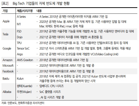 지금까지 비메모리 반도체 업계는 철저한 분업화와 적절한 타겟 시장 창출을 통해 성장해 왔다. 다시 말해, 팹리스 업체는 칩 설계만 하고, 파운드리 업체는 생산만 담당했으며, 제조사들은 팹리스 업체들의 기성 제품을 잘 활용해 완성품을 만들기만 하면 됐다. 파운드리의 고객은 단순히 팹리스에 국한됐고, 제조사들은 팹리스 업체 하고만 거래하면 됐다. 하지만, 최근 몇 년간 이런 생태계가 빠르게 뒤바뀌고 있다. Big Tech 기업들이 자기네들의 쓰임새에 정확히 맞는 자체 반도체를 개발하게 되면서부터다.