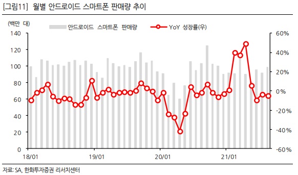 아이폰을 제외한 안드로이드 계열 스마트폰의 판매량도 동반해서 회복하고 있다. 지난 4~5월 AP 등 핵심부품의 공급부족 난이 극심할 당시 판매량이 급감해 스마트폰 수요에 대한 우려가 증폭됐으나, 7~8월에는 회복하고 있다. 연말까지 회복세가 유지된다면 전반적인 모바일 수요 회복에 대한 기대감이 반영되어 연말부터 디램 공급자들이 모바일에 할당하는 생산 캐파를 늘릴 수 있어 서버 디램 공급과잉을 충분히 상쇄해 줄 수 있을 것이다. 참고로, 안드로이드 계열 스마트폰이 아이폰에 비해 부품 공급부족에 취약한 것은 퀄컴, 미디어텍과 같은 기성 AP를 쓰기 때문이다. 아이폰은 자체 설계한 A시리즈 칩을 TSMC로부터 비교적 안정적으로 공급받고 있어 이런 리스크가 덜한 편이다.