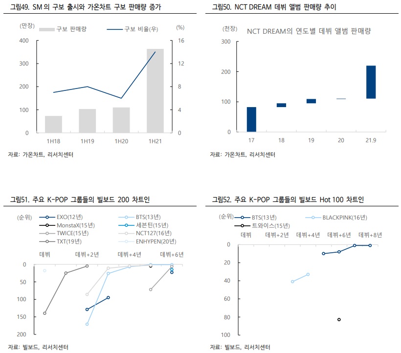 1) 음반 수출 데이터는 가온차트 Top400 판매량을 선행하는 고성장 흐름을 이어오고 있다. 올해 8 월 누적 기준으로 이미 2020 년 연간 수출액을 넘어섰으며 9 월 누적 YoY 성장률은 +115%에 달한다. 또 하나의 증거는 2)구보 판매량 급증이다. 구보 구매는 아티스트의 기록 경신에 카운트되지 않기에 신규로 유입된 팬이 순수하게 수집을 목적으로 구매한다. 올해 정규 앨범으로 300 만장을 돌파한 NCT 드림은 1H21 데뷔 앨범 판매량만 11 만장에 달한다. 참고로, K-POP 에서 가장 큰 IP 로 꼽히는 BTS 는 지속적으로 신규 팬덤이 유입되면서 데뷔 앨범 판매량(‘13 년 2.4 만장 vs 21 년 8.8 만장)이 꾸준히 성장 중이다.