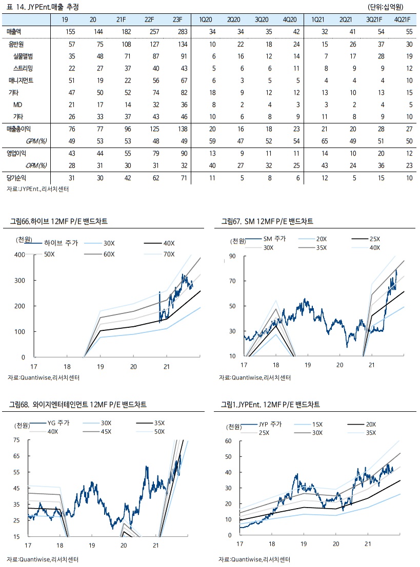 2 년 가까이 공백기를 가진 산업의 가장 큰 수익화 수단, 콘서트가 돌아온다. 1)기존 팬덤의 펜트업 디멘드만으로도 K-POP 아티스트들의 공연 규모 확대가 예상되는데 2 장에서 살펴보았듯이 SNS/음원/음반 데이터가 모두 2)글로벌 신규 팬덤의 성장을 가리키고 있다. 2022 년 온기로 투어가 가능할 북미/유럽/일본 지역에서 주요 K-POP 아티스트들의 투어의 급이 달라질 것으로 예상되며, 해당 아티스트들을 보유한 4 대 기획사의 증익 모멘텀이 기대된다. 섹터에 대한 비중 확대 의견을 유지하며 역대급 투어가 예상되는 하이브를 탑픽으로 유지한다.