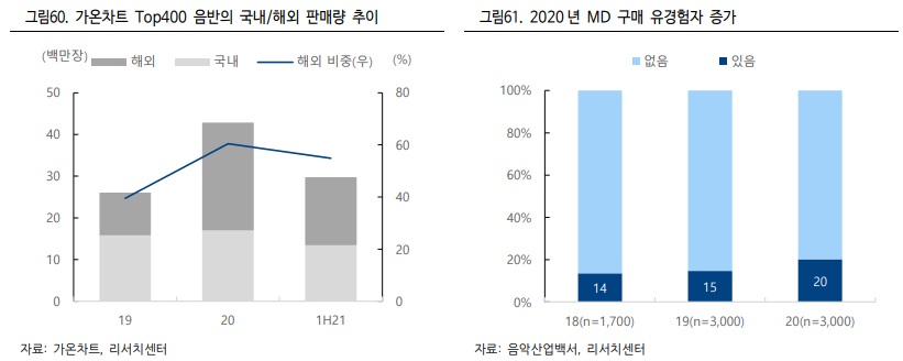 지난해 K-POP 음반의 해외 판매량 성장률이 150%를 상회했다는 점을 감안한다면 처음으로 음반을 구매하기 시작한 글로벌 팬덤이 머지않아 재개될 글로벌 투어들에서도 보다 활발하게 MD 를 구매할 가능성에 대해서도 고민해볼 필요가 있다. 공교롭게도, 음반 판매량이 고성장한 2020 년 국내 소비자들의 MD 구매 경험율은 5%p 상승했다.