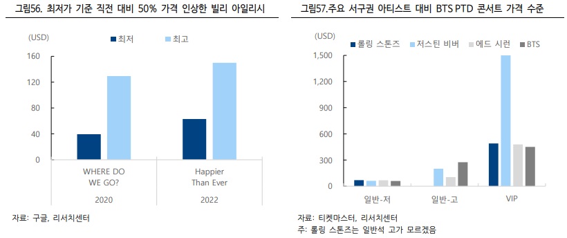 BTS 는 최근 발표한 LA 공연에서 2020 년 예정이던 MOTS 투어 수준의 가격을 유지했는데, 선예매로만 4 회의 스타디움을 매진시켰다는 점(높은 펜트업 디멘드)과 주요 서구권 아티스트들 대비 ATP 가 높지 않음을 감안할 때 추후 가격 인상 가능성(전반적 가격 인상 or 티켓 믹스 변화)은 충분히 열려 있다고 판단한다.