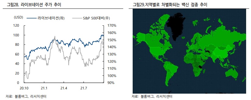 글로벌에서 가장 먼저 백신 접종을 시작한 북미/유럽 지역에서는 이미 여름부터 대규모 투어가 재개되었으며, 국내와 일본 역시 접종 완료율이 빠르게 올라오면서 연말 주요 아티스트들이 속속 대규모 공연 계획을 발표하고 있다. 리오프닝 모멘텀이 부각되면서 고멀티플 종목들의 부진에도 적자 회사인 글로벌 프로모터 라이브네이션의 주가는 사상 최고 수준에 머무르고 있으며, K-POP 엔터사들의 주가 역시 최근 2 주간 반등 흐름을 보여주고 있다.