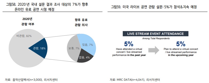 라이브 공연이 돌아오면 온라인 공연은 사라질까? 당사는 온라인 공연이 오프라인과 병행되어 유지될 것이며 오히려 성장 가능성이 크다고 본다. 코로나 19 구간에서 1 년에 1~2 회 유료 온라인 공연을 시청하는 습관을 K-POP 팬덤이 학습했기 때문이다. 국내외 설문조사 결과들 역시 같은 방향을 가리키고 있다. 2020 년 국내에서 진행한 설문조사 결과 응답자의 18%가 온라인 공연을 봤으며, 그중에서 40%(즉, 전체 설문자의 7%)가 향후 유료 온라인 공연을 시청할 것이라고 응답했다. 미국의 설문 결과도 크게 다르지 않다.