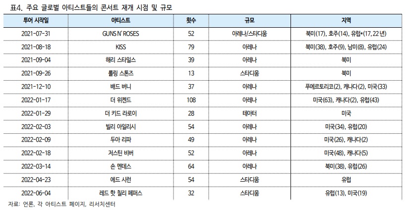 이번 LA 공연은 한 도시에서만 스타디움을 4 회 매진시켜 BTS 팬덤의 높은 수요를 확인했다는 점에서 의미가 크다. 다만, 오프라인 공연이 전사 실적에 의미 있게 기여하기 위해서는 4~50 회 규모의 월드투어 재개가 필수적이기 때문에 월드투어 재개 시점에 귀추가 쏠리고 있다. BTS 와 유사한 급의 글로벌 아티스트들은 이미 북미/유럽에서 투어를 재개했거나 계획을 발표한 상황이다. GUNS N’ ROSES/KISS 등은 이미 7-8 월 북미를 시작으로 아레나급 투어를 재개했으며, 더 위켄드/빌리 아일리시/저스틴 비버 등도 내년 초 50 회~100 회 규모의 북미/유럽에서의 월드투어를 발표했다. 일반적으로 투어 계획부터 실시까지의 리드타임이 약 6 개월 걸린다는 점을 감안할 때, 내년 상반기 안에 투어를 개시할 예정이라면 늦어도 연말 전후로 투어 일정 발표가 기대된다.