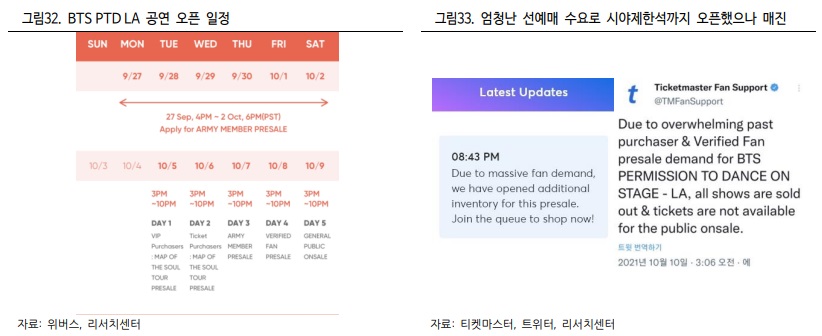 국내 아티스트로는 BTS 가 처음으로 미국 추수감사절 연휴 기간에 4 회의 LA SoFi 스타디움 공연 일정(11/27~12/2)을 발표하면서 글로벌 리오프닝 흐름에 올라탔다. 10월 5일부터 4일간 ‘기존 MOTS 티켓 구매자’, ’ARMY멤버십 가입자’, ‘Ticketmaster 인증 팬’을 대상으로 순차적인 티켓 오픈이 있었다.