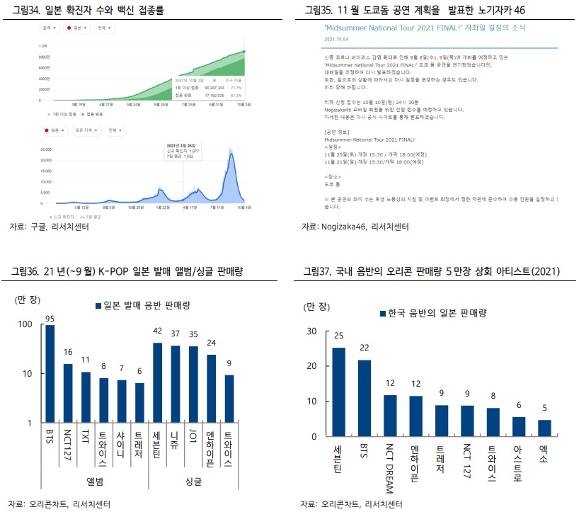 안정적인 코로나 지표들에 힘입어 9 월 19 일 니쥬가 참여한 조조 마린스타디움에서 ‘슈퍼소닉’ 페스티벌이 성료된 바 있으며, 최근에는 노기자카 46 이 11 월 20/21 일 2 일 동안의 도쿄돔 공연 계획을 밝히기도 했다. 노기자카 46 의 도쿄돔 공연이 성료된다면 일본에서 막강한 인기를 구가하고 있는 K-POP 아티스트들의 순차적인 투어 발표가 가능할 것으로 예상된다.