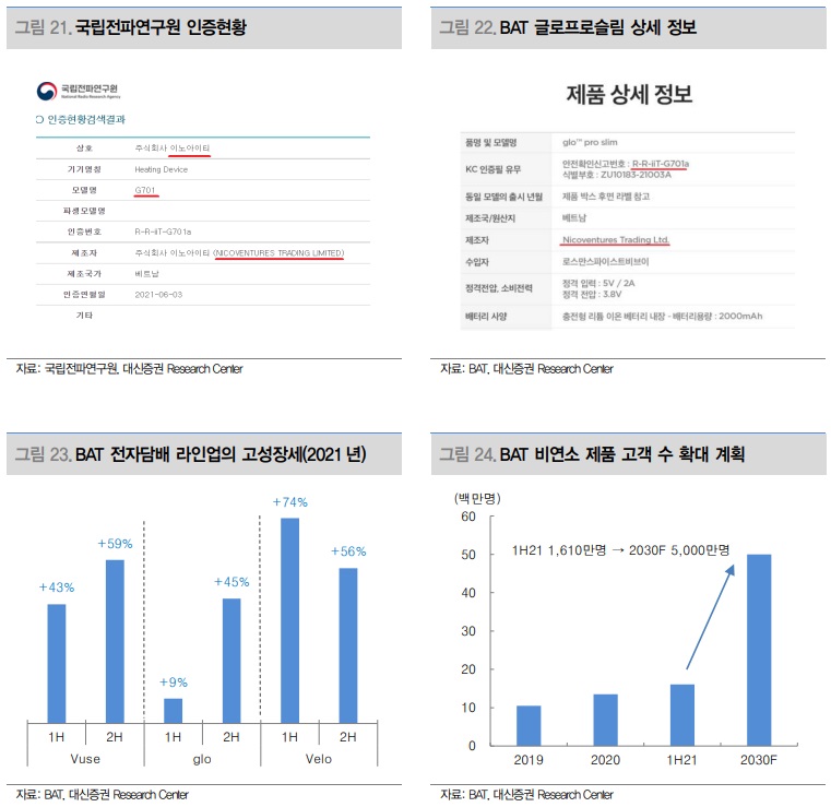 KT&G에 이어 국립전파연구원의 KC 인증을 참고할 때 글로벌 메이저 담배업체 BAT로의 공급이 시작된 것으로 추정된다. 올 하반기를 기점으로 중장기 성장이 확실시된다. 지난 6월 이노아이티는 히팅 디바이스 모델 G701의 적합성평가를 받았다. 이노아이티는 2020년 11월 이엠텍이 설립한 100% 자회사다. 제조자에는 이노아이티와 니코벤쳐스가 같이 표기됐다. 니코벤쳐스는 BAT의 자회사다. 그리고 9월 BAT는 국내에 글로 프로 슬림 모델을 출시했고, 이 모델의 인증번호와 일치한다. 이를 통해 이노아이티가 BAT의 전자담배 생산을 담당하는 것을 유추할 수 있다.