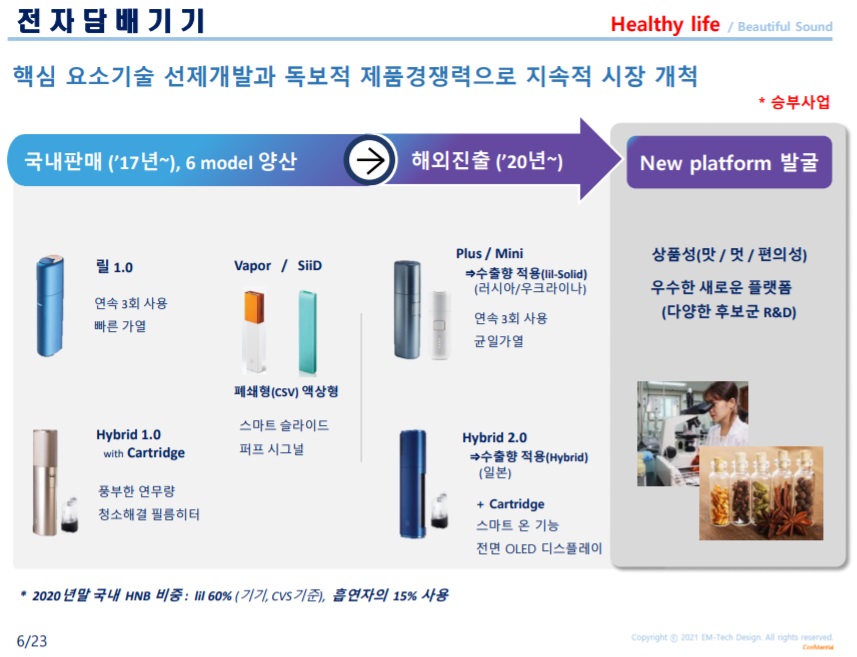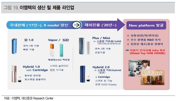 차별화된 디바이스 제조 기술력 및 레퍼런스 → 시장 선점 효과 이엠텍은 2017년 KT&G의 궐련형 전자담배 릴 출시 이후 현재까지 디바이스를 생산하고 있다. 자체 기술력을 바탕으로 제품 설계부터 생산까지 담당하고 있다. 액상형 전자담배와는 달리 전 세계 시장에서 궐련형 전자담배 디바이스 생산 업체는 10여개 내외로 제한적인 상황이다. 이중 개발, 설계에서 생산까지 ODM 형식으로 제조하는 회사는 글로벌 1위 전자담배 생산 업체인 Smoore International과 이엠텍 정도로 파악된다.