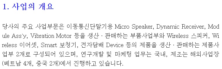 동사의 주요 사업부문은 이동통신단말기용 Micro Speaker, Dynamic Receiver, Module Ass'y, Vibration Motor 등을 생산ㆍ판매하는 부품사업부임.