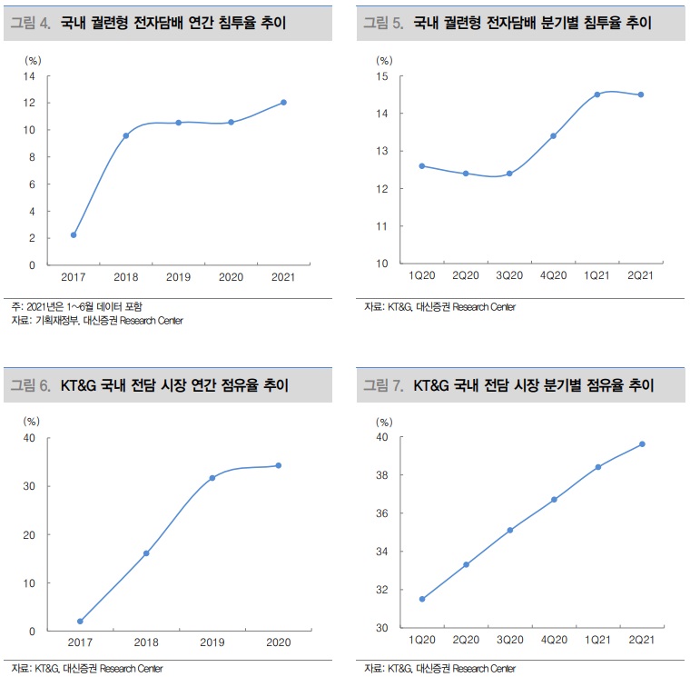 반도체 쇼티지 영향을 받기 전인 3Q20~1Q21 제품 사업부의 이익률은 평균 10% 이상을 기록했었다. 하반기 생산량 확대에 따른 규모의 경제 효과가 기대된다. 전자담배를 대규모 양산하는 글로벌 제조 업체들의 영업이익률은 30%를 상회(2021F OPM Smoore 45.3%, RELX 30%)한다. 매출 고성장 시 지속적인 이익률 개선이 가능할 전망이다.
