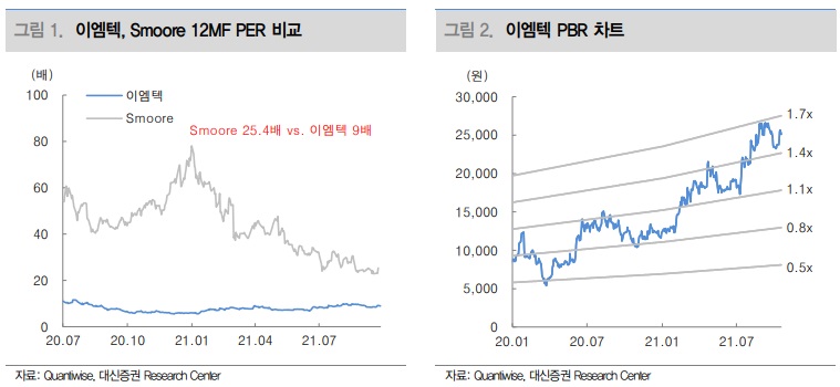 전세계 전자담배 디바이스 제조 업체 중 설계부터 생산까지 ODM 공급을 하는 곳은 글로벌 1위 Smoore International과 이엠텍 정도로 파악된다. Smoore International의 2021년 예상 실적은 매출액 2조원, 영업이익 9,000억원이며 현재 홍콩 증시에서 시총 32조원에 거래된다. 이엠텍의 2021년, 2022년 예상 영업이익은 351억원(+1,600% YoY), 590억원(+68% YoY)인 반면 시총은 3,988억원에 불과하다. 이번 3분기를 기점으로 글로벌 Top-tier 생산 업체로 변모하는 점을 고려하면 현 주가 수준은 절대적인 저평가로 판단한다.