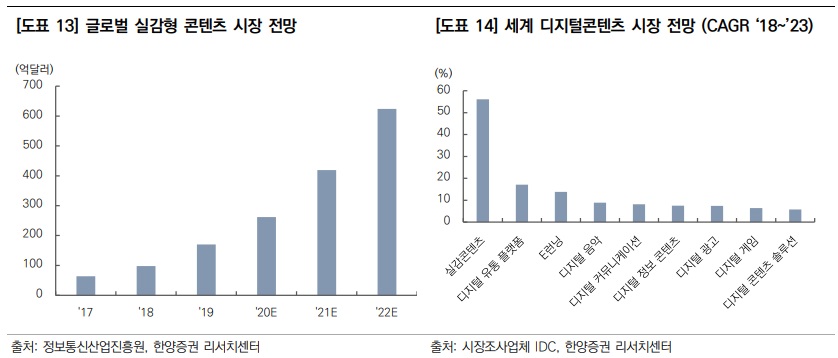 메타버스 선도 산업 엔터 산업은 메타버스 수혜로 주목받는 산업 중 하나이다. 연예기획사가 가진 IP에 메타버스 기술을 접목시킴으로써 생산할 수 있는 콘텐츠가 무궁무진하기 때문이다. 완벽한 메타버스 시대가 도래했다고 말하기는 어렵지만, 현재 그 과도기에서 생산 및 판매되고 있는 실감형 콘텐츠들도 상당하다. 대표적인 콘텐츠 중 하나는 XR 라이브 콘서트가 있다. 현재는 대부분의 실감형 콘텐츠들이 콘텐츠 제작사를 통해 제작되고 네이버 등 대형 플랫폼을 통해 송출되는 경우가 많으나, 가까운 미래에는 엔터 플랫폼사들이 콘텐츠를 직접 생산 및 유통하는 주체가 될 수 있을 것으로 보인다.