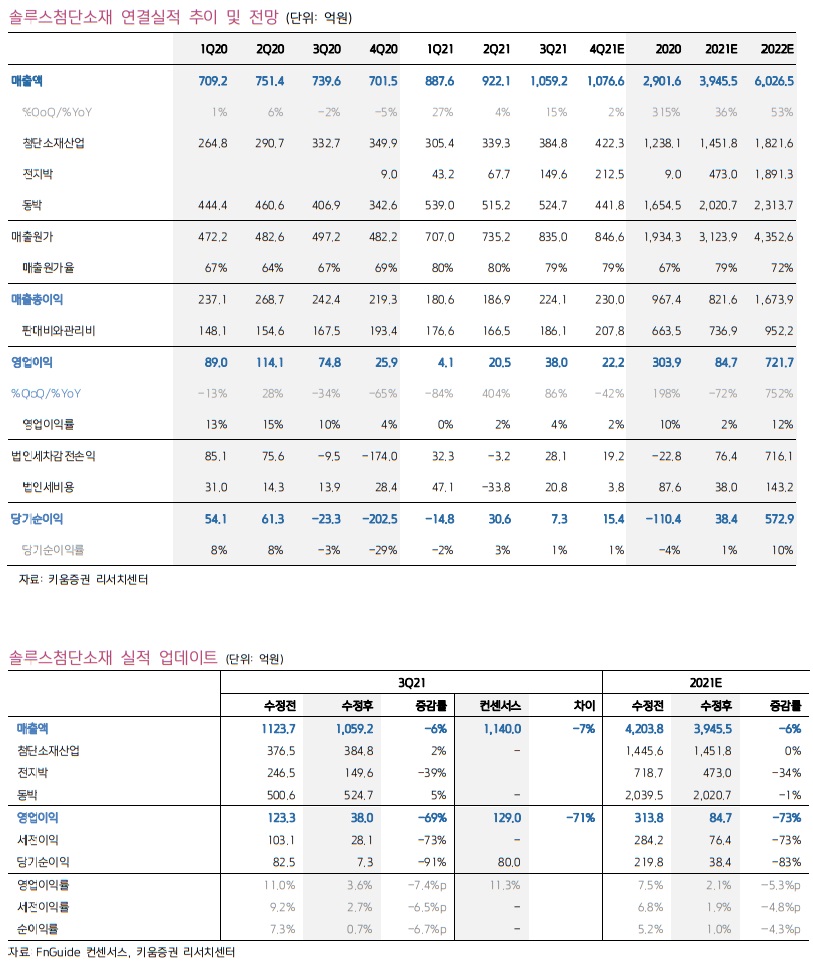솔루스첨단소재의 3Q21 실적은 매출액 1,045억원(+13%QoQ, +41%YoY), 영업이익 38억원(+83%QoQ, -50%YoY)으로 시장 컨센서스 및 당사 추정치를 하회했다. 첨단소재산업은 OLED 소재 부문이 계절적 성수기를 맞이하며 예상치에 부합했으나, 전지박 부문은 ①3Q21에 발생한 품질 이슈 및 차량용 반도체 공급 부족 여파로 인해 예상치를 하회했다. 전지박 품질 문제는 유럽 내 빠른 현지 대응을 통해 11월부터는 정상 출하가 재개되고 있다. 다만 예상치 못한 품질 이슈로 인해 전지박 흑자 전환 시점은 4Q21 → 2Q22로 지연될 것으로 판단된다.