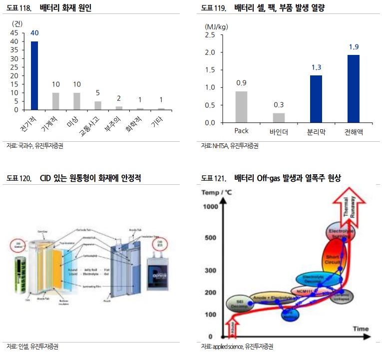국립과학수사연구원에 의하면 기존 배터리 화재 사고 이유로 전기적 요인이 가장 많은 것으로 밝혀졌는데, 최근 화재는 과충방전 이슈보다는 특정 제조사의 제품 특성 및 결함, 이로 인한 내부단락, 접힘 등이 주요 원인으로 추정되고 있다. NHTSA 에 의하면 배터리 Cell 연소 시 발생하는 열량은 4.03MJ/kg. 이 중, 전해액, 분리막으로 인한 연소 영향이 가장 큰 것으로 파악된다. 전해액 분해는 일반적으로 분리막, 내부단락, 충방전 다양한 이슈로 인한 offgas 발생, 복합적인 이유 때문에 이루어진다. 원통형, 각형 배터리는 CID, Vent 등 부품을 활용해 전해액 열폭주 현상으로 전이되기 전 열관리를 용이하게 할 수 있는 반면 파우치 전지는 전해액으로 이를 컨트롤하므로 고온에서 취약성을 보이고 있다. 부품단에서 화재에 가장 큰 영향을 미치는 것은 분리막이며 배터리용량을 확대하기 위해 얇게 생산하면서도 안정성을 확보할 수 있는 분리막을 사용하는 것이 중요하다. 전고체 전지의 도입이 2030 년은 되어야 가능함을 고려하면 분리막의 중요성은 앞으로 더욱 부각될 가능성이 높고, 셀 업체와 가격협상에서 우위를 점할 것이라 판단한다.