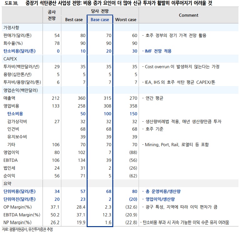 중국의 호주산 석탄 수입 금지와 동절기 수요 증가가 겹쳐 석탄 가격도 250 달러/톤을 상회하였다. 그러나 중국 정부가 총 2 억톤의 자국 석탄 생산 확대를 예정하고 있어 수급 밸런스는 장기적으로 안정화될 전망이다. 그럼에도 여전히 2019 년의 절반 수준에 불과한 재고 레벨은 시장 안정화에 시간이 걸릴 것을 암시하고 있다. 여기에 인건비 증가, 산업용 경유 가격 급등, 장기적인 탄소비용 부과로 석탄의 생산원가는 지속 상승할 전망이다. 길게 보면 석탄 수요 감소가 이어지고 비용은 늘어나는 국면으로 진입해 신규 광산 투자가 집행되기는 어려울 것이다. 동절기가 지나고 재고 안정화가 본격적으로 진행될 예정이며 상고하저의 흐름, 평균 120 달러/톤 수준으로 안정화될 것이라 전망한다.