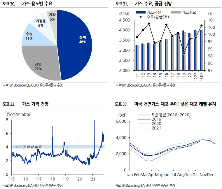 가스 수요는 2030 년까지 지속 증가할 것으로 전망된다. 석탄 발전소가 단계적으로 사라지고 그 자리를 재생에너지가 대체하는 과정에서 가스가 다리 역할을 할 수 있기 때문이다. 또한 장기적으로 가스 사용량의 40%는 CCS 기술과 결합되어 블루수소의 원료로 소비될 전망이다. 이런 현상은 2022 년부터 더욱 가속화될 것이라 판단하며, 최근 급등한 가스 가격은 코모디티 특성상 평균으로 회귀하며 안정화를 모색하는 가운데 10 년 평균 3 달러/mmBTU 를 30% 상회한 4 달러/mmBTU를 기록할 것이라 추정한다.