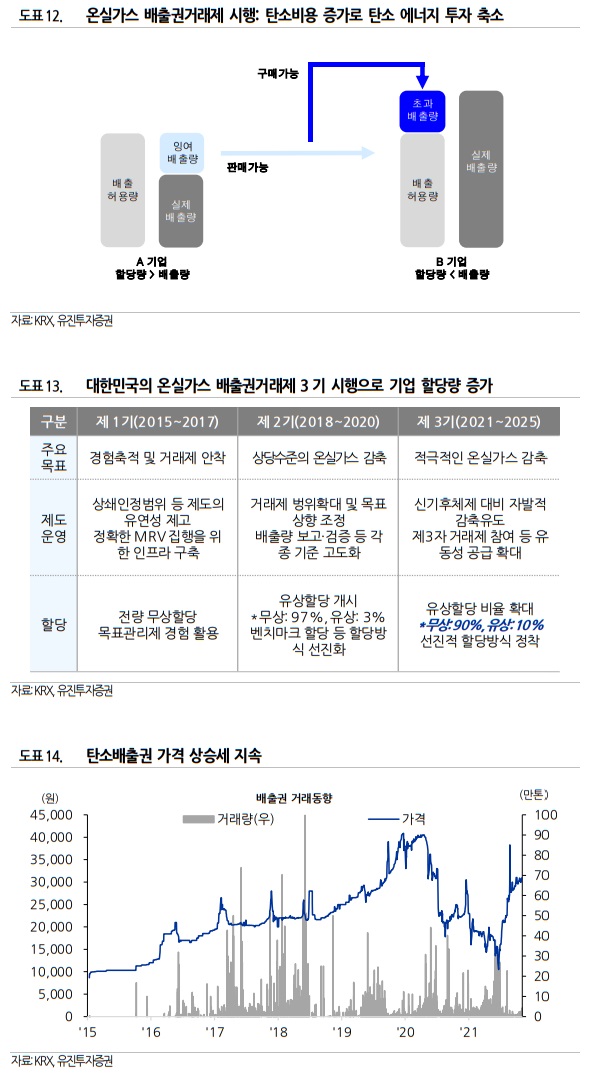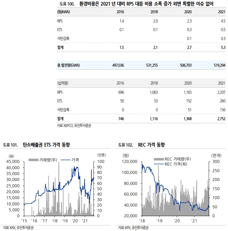한국전력의 기후환경요금은 1 년씩 후행적으로 조정되고 있다. 2021 년 3 차 배출권거래제 시행으로 배출권할당량이 10%로 늘어났음에 반해 요금은 2020 년을 기준으로 반영되며 환경비용 전가가 제대로 되지 않았다. 이 규모는 약 1 조원 수준으로 추정되는데, 2022 년부터는 요금에 제대로 반영될 수 있다. 3 차 기간이 2021~2025 년까지 이므로 할당량이 2022 년에 크게 늘지 않는다. 단가 상승에 대한 부담은 석탄발전소 가동률 하락으로 만회가 가능할 것이라 판단한다. RPS 대응비율은 매년 1%p 상승하고 있다. REC 가격이 바닥을 형성하고 있는 상황에서 비율 상승으로 인한 비용 4천억원 증가가 예상된다. 2021 년에 비하면 비용 증가 규모가 6 천억원 이상 작은 것이다.