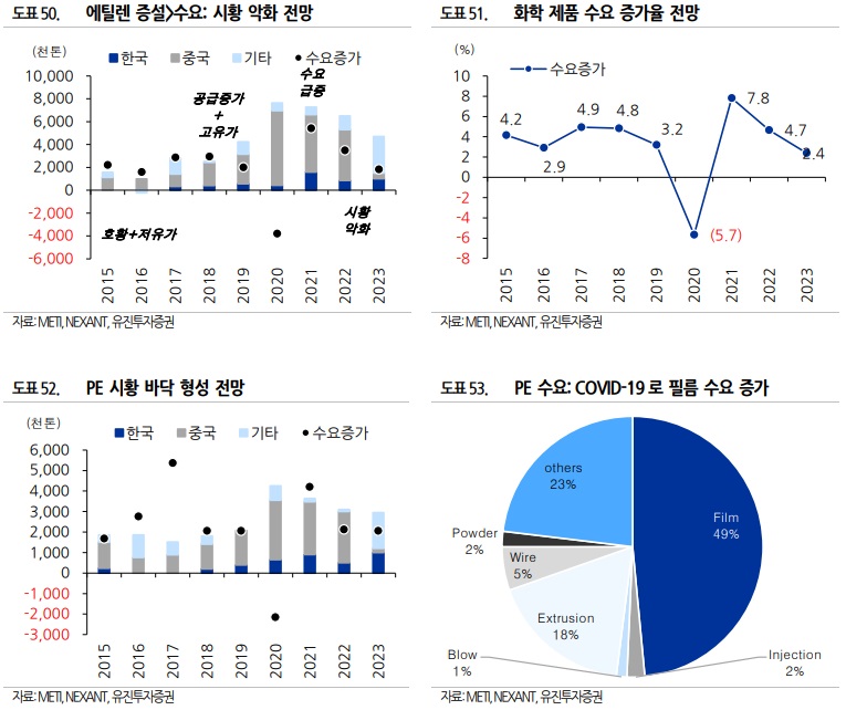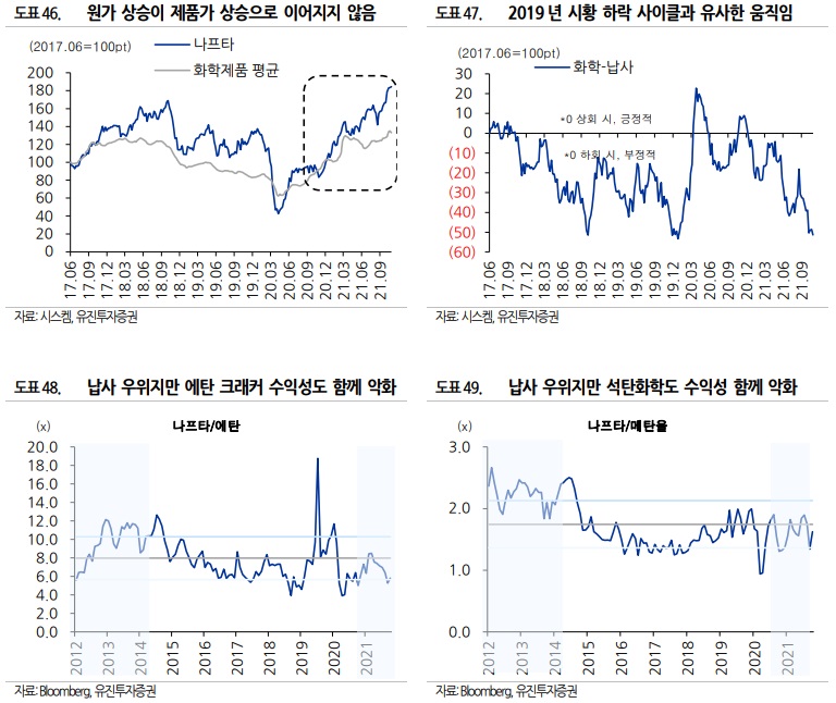 2022 년 국내 NCC 의 수익성에 가장 큰 영향을 줄 것은 원료인 나프타의 가격 상승이다. 2020 년 4 월 슈퍼 콘탱고를 지난 이후부터 2021 년 하반기까지 국제유가가 빠르게 상승했고 나프타도 덩달아 상승해 NCC들의 수익성은 악화되고 있다. 슈퍼 콘탱고의 시장 상황에서는 향후 코모디티 가격 상승세를 예상해 수요도 오히려 살아나는 움직임을 볼 수 있다. 그러나 현재의 강한 백워데이션 환경에서는 설비 공급 트러블이 없다면 오히려 화학제품 가격 하락에 대한 우려가 커 재고 축적 수요(가수요)는 감소하고 관망세가 이어질 수밖에 없다. ECC 와 CTO/MTO 의 원재료라 할 수 있는 에탄과 메탄올의 가격상승이 동반되어 원가 경쟁력 측면에서는 우위를 점하지만 수급 악화로 수익성이 대폭 개선되기는 어려운 환경이 이어질 전망이다.
