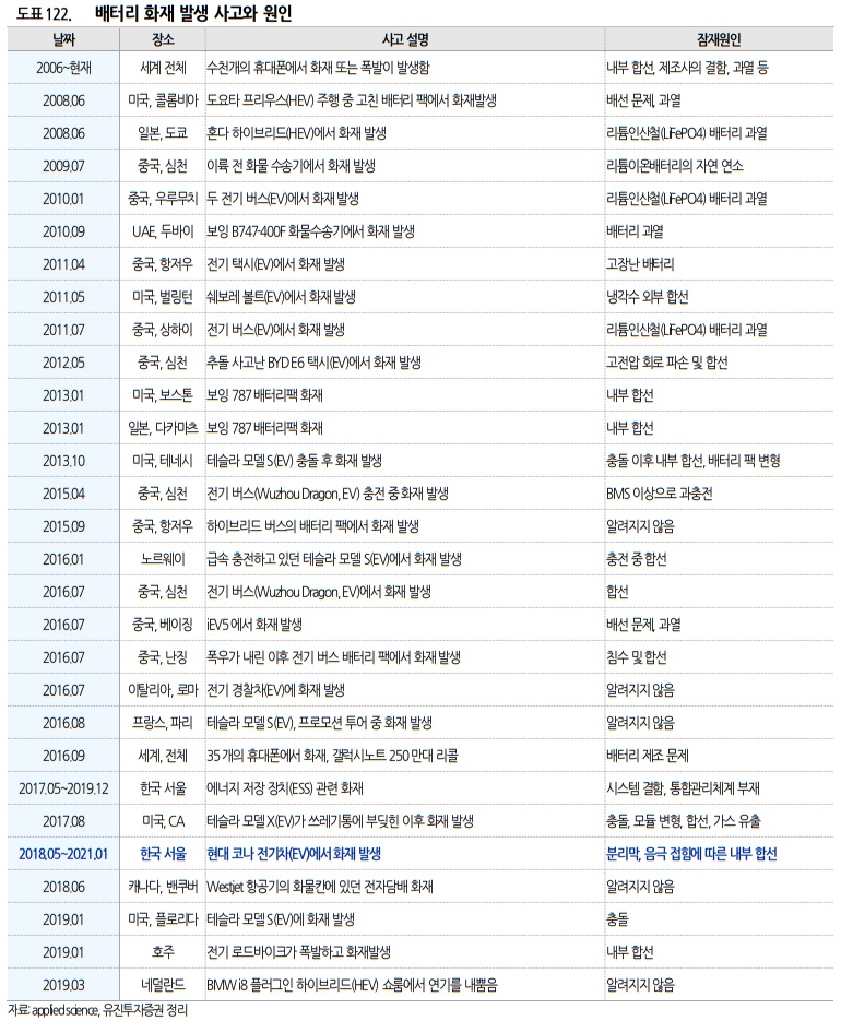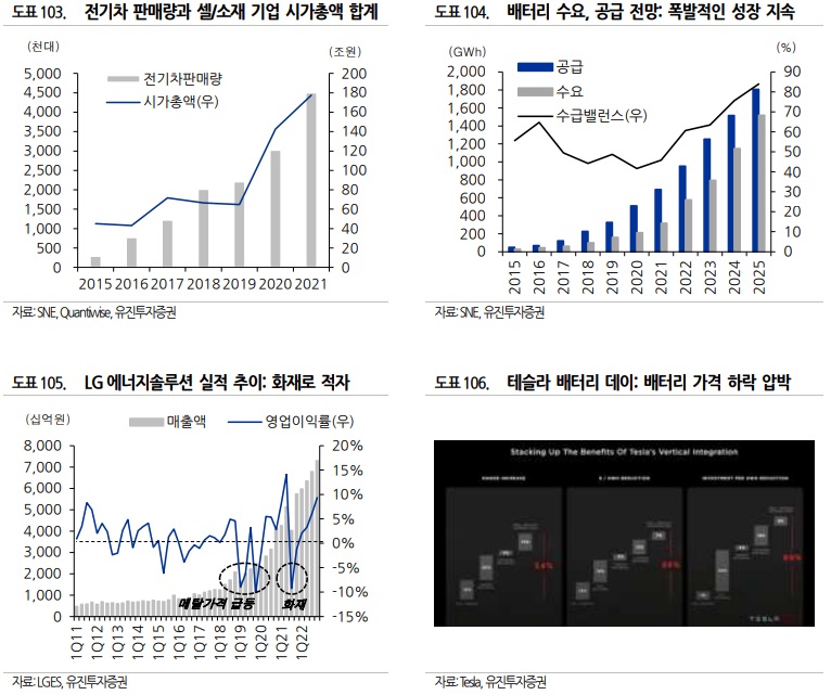 2021 년 글로벌 전기차 판매량은 400 만대를 돌파하며 시장 침투율 5%를 상회할 것으로 예상된다. 각국의 내연기관차 판매 금지 정책을 고려하면 이 추세는 2030 년까지 이어질 전망이다. 국내 배터리 업체들의 시가총액 합계는 글로벌 전기차판매량, 시장점유율, 수익성과 동행하며, 폭발적인 성장세는 2022 년에도 지속될 것으로 예상되어 긍정적이다. 그러나 높은 밸류에이션을 정당화하기 위한 1) 수익성(배터리 화재 충당금 등), 2) 시장점유율(LFP, 각형)에 대한 근거가 필요하다고 판단한다. 2020 년까지 배터리 성능 향상을 통한 단가 하락, 점유율 싸움이 배터리 업계의 주요 화두였다면, 2022 년부터는 안정성, 수익성을 기반한 안정적 성장이 주요 화두로 떠오르며 노이즈가 지속될 수 있다.