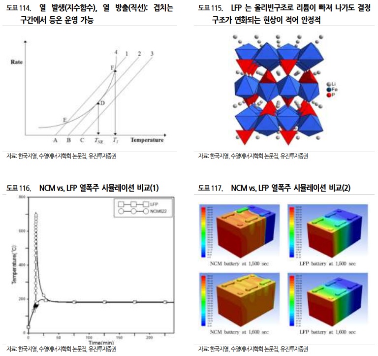 리튬전지 온도는 발생한 열과 방출된 열의 균형으로 정해지는데 열의 발생은 지수함수로 증가하는 반면, 열의 방출은 선형적으로 증가하는 특성을 보인다. 아래 그래프에서 볼 수 있듯이 직선 1 은 E, F 에서 교차하여 두 지점 모두 등온 운영이 가능한 원리를 설명하고 있다. 직선 3 은 교차지점이 없기 때문에 어떤 상황에서도 열제어가 불가능하다. LFP 배터리는 인산철을 활용해 층상구조가 아닌 올리빈 구조를 하고 있어 매우 안정적이며 리튬이온이 빠져나가도 결정 구조가 연화되는 현상이 적지만 NCM 은 층상구조로 되어 있어 취약하다. 또한 분리막으로 사용되는 폴리올레핀은 녹는점이 125~160 도 이므로 고온에서 안정성이 취약할 수밖에 없고 배터리 용량 확대를 위해 최대한 얇게 제작하고 있어 위험은 증가하고 있다. 결국 화재를 방지하기 위해서는 1) 최적화 운영보다 여유를 두고 운전(SOC 하락), 2) 부품을 활용해 offgas 를 조기에 방출(원통형, 각형), 3) LFP 를 사용해 열폭주 방지, 4) 분리막 분해를 늦추는 방법이 최선이다. 즉, LG에너지솔루션은 NCM 하이니켈에 파우치를 적용하고 분리막도 중국 제품을 확대해 화재가 발생할 확률이 높다고 판단한다.