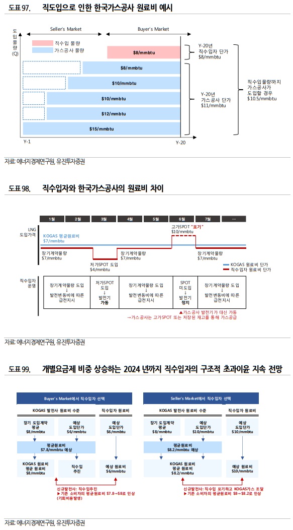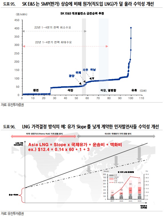 국내 LNG 도입량은 연간 4 천만톤이며 이 중 직도입 발전사의 수입량은 1 천만톤을 상회한다. LNG 시장은 바이어와 셀러가 수급상황에 따라 서로 계약을 유리하게 가져가는 구조로 되어 있으며, 작년까지 미국산 LNG 수출량 증가, 가스 가격 하향안정화로 바이어들이 저렴한 가격으로 구매계약을 맺을 수 있었다. 반면, 한국가스공사는 국내 에너지안보를 위해 중동 국가를 중심으로 유가연동방식의 장기계약을 진행해왔고 최근에야 계약기간이 만료된 오만, 카타르 물량에 대한 계약을 진행했다. SK E&S 는 인니 탕구, 호주 고르곤, 미국 사빈패스를 중심으로 가스를 조달하고 있으며 유가 슬로프는 평균 0.1 수준으로 한국가스공사 0.14 의 71%에 불과한 것으로 추정되고 있다. 그러므로 지금처럼 LNG, 석탄 모두 상승하여 SMP 가 높게 유지되는 경우 원가보다 판가 상승률이 높아 마진 스프레드는 확대될 가능성이 높다. 적어도 2022 년 상반기까지 SMP 가 120~150 원/kWh 을 유지할 것으로 보여 민자발전사의 초호황이 지속될 전망이다.