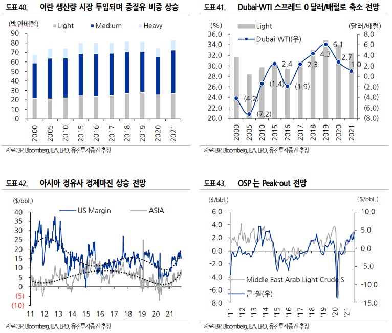 반면, 앞서 E&P 기업들의 생산 병목현상으로 미국의 원유 생산은 1,100만b/d에서 크게 회복되지 못할 것으로 추정된다. 미국산으로 대표되는 경질유 비중이 2021 년 대비 하락하고 Dubai 가격 하락, WTI 의 상대적 강세로 가격 갭은 축소될 전망이다. 상대적으로 무거운 석유제품인 연료유는 가격 약세가 연간 내내 이어져 정유사의 윤활유 사업 마진 스프레드도 지속 확대될 것이라 판단한다.