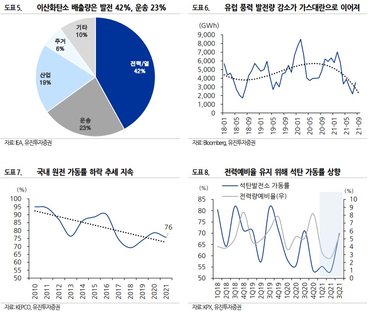COP26에서 지구의 기온 1.5℃ 상승 제한을 위한 여러 서약들이 쏟아지고 있지만 실제 이행 및 구체적 방안에는 의문이 따른다. 대부분의 서약에 구체성이 결여되어 있고 현실적인 문제들과 충돌이 우려되고 있기 때문이다. 세계 105 국이 2030 년까지 산림파괴를 중단하고 온실가스배출량을 30% 감축하기로 결정했고, 40 개 국가는 석탄발전소도 폐지하기로 결정했으나 이는 단계적인 방침일 뿐이다. 엄밀히 말하면 한국도 2030 년 이후 단계적 폐지에 동의를 한 것에 불과하다. 또한 정확히 국가별, 산업별로 어느 정도의 규모로 실행할지, 서약을 지키지 못했을 때의 페널티 등 보완해야 할 점이 남아있다. 당장 한국의 사례만 봐도 해외 화석연료 투자사업에 공적금융 지원을 중단(K-Taxonomy)하기로 했지만, 여름 전력수급이 피크를 향하자 50%를 유지하던 석탄발전소 가동률을 70% 이상으로 상향했고, 오히려 탈원전 회의론만 불러일으킬 처지에 놓였다. 중국도 급격히 회복된 전방 산업 영향으로 공장, 발전소 가동률 상승, 에너지수급의 문제가 발생하며 그린플레이션을 부채질하고 있다. 물론 장기적으로는 탈탄소로 가는 방향성이 명확하지만, 2022 년 에너지 업종은 그린플레이션과 그린 병목현상에서 자유롭지 않을 전망이다.