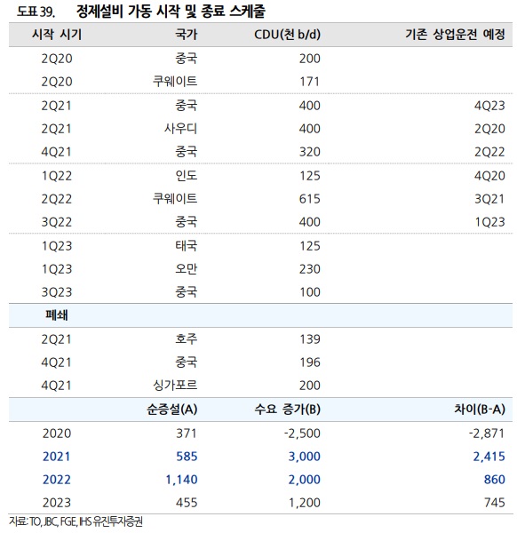 2021 년 세계 정제설비 순증설 용량은 0.6 백만b/d 로 2019 년의 절반에 불과하다. 2020 년 발생한 COVID-19 여파로 설비 폐쇄가 집중되었고 2021 년 셧다운 증가로 시황은 회복 중이다. 이 영향으로 2022 년 상업운전을 시작하는 정제설비 용량이 오히려 기존 전망치보다 늘어날 것으로 예상된다. 당사가 추정하는 2022 년 정제설비 순증설 용량은 1.1 백만 b/d 로 올해 대비 공급 부담이 발생할 수 있다. 그러나 석유제품 수요는 여전히 2019 년의 95% 수준에 불과해 정상 수준에 도달하지 못한 상황이다. 당사 추정 수요 성장은 2.0 백만b/d 로 2% 이상 성장이 예상되며, 이는 공급 증가를 상쇄할 수 있는 규모라 판단한다. 오히려 빠른 수요 회복 여부, 원가 경쟁력에서 우위를 점할 수 있는지가 더 중요한 포인트이다.