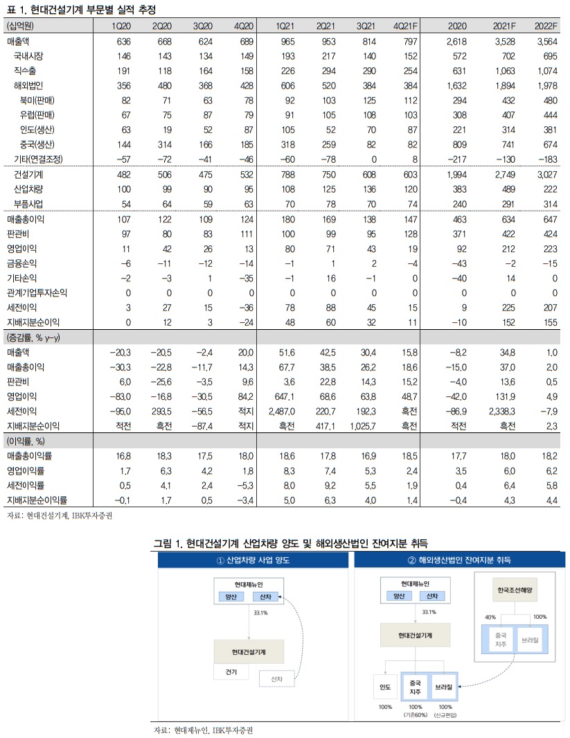 2022년 연간 실적은 매출액 3조 5,637억원(+1.0% yoy), 영업이익 2,227억원(+4.9% yoy), 영업이익률 6.2%(+0.2%p yoy) 전망. 2022년 1월 1일부로 산업 특성이 다른 산업차량 사업을 현대제뉴인에 매각하는 한편 한국조선해양이 보유한 해외생산법인 지분을 매입하여 건설기계 사업에 역량을 집중할 계획. 산업차량 매출의 40% 정도를 차지하는 선진국 판매를 현대건설기계에서 담당할 예정이고, 브라질법 인도 연결 반영되며, 선진국의 인프라 투자에 따른 수요회복으로 중국 감소분을 만회할 것으로 전망. 결과적으로 산업차량 양도로 영업이익률 개선, 해외법인 지분취득으로 이익 확대 기대.