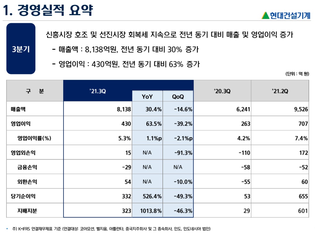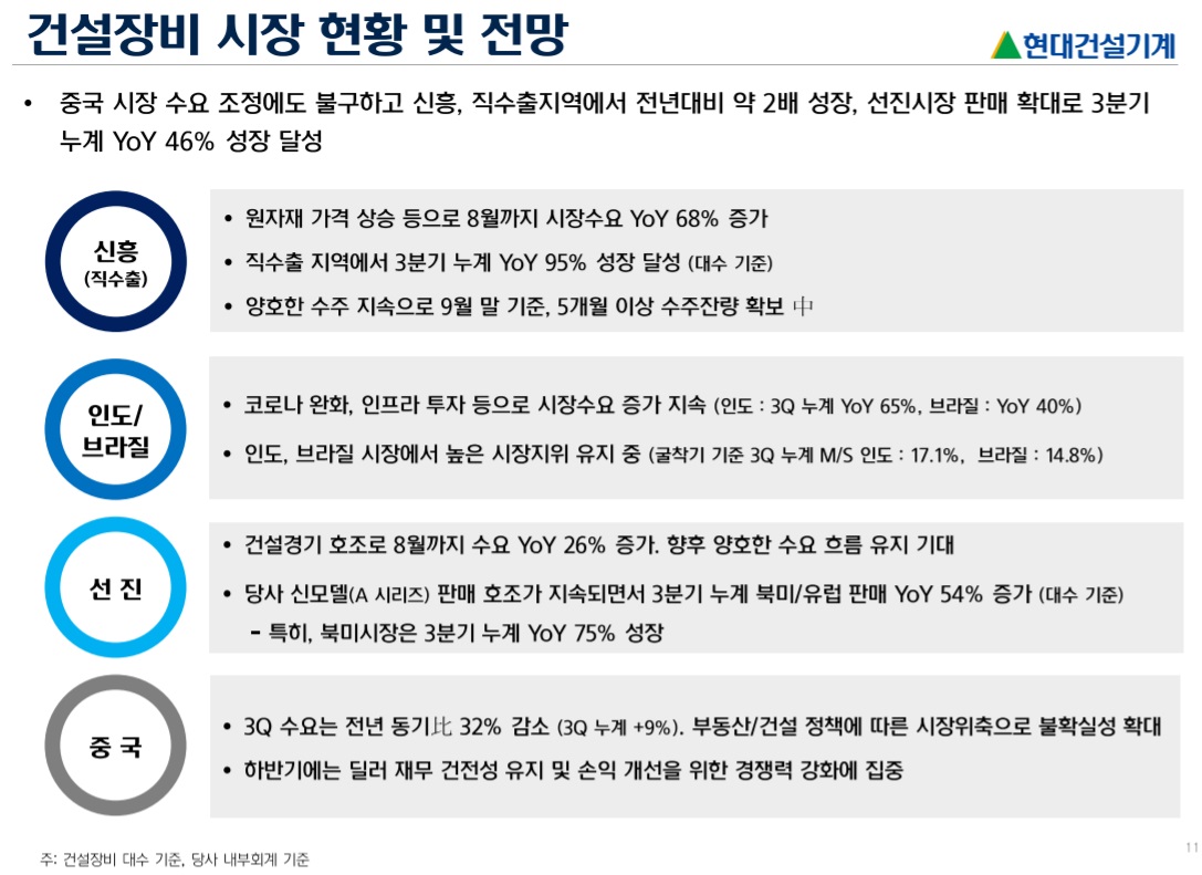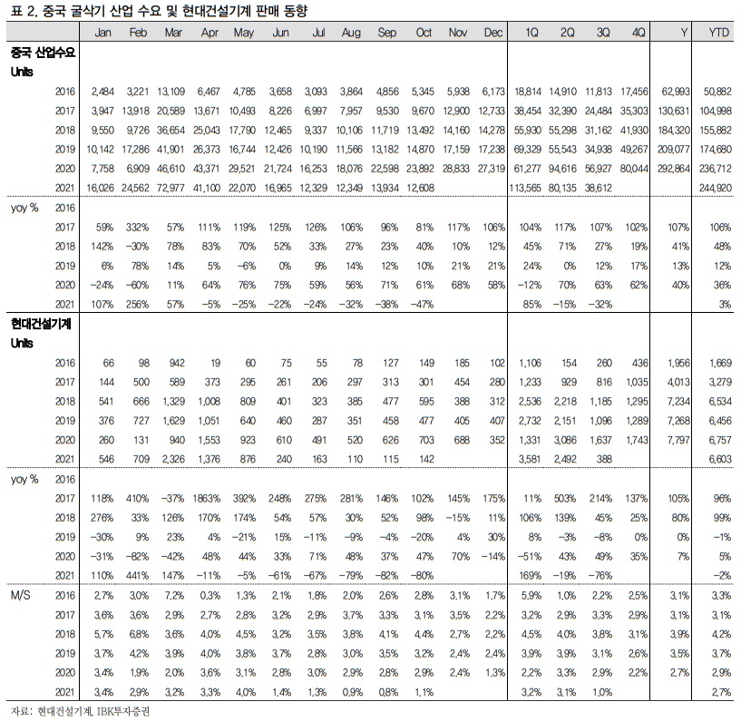 2021년 4분기 실적은 매출액 7,972억원(+15.8% yoy), 영업이익 189억원(+48.7% yoy), 영업이익률 2.4%(+0.6%p yoy) 전망. 전년동기비 매출은 중국을 제외하고 직수출, 선진국, 인도시장 등에서 개선되는 모습 전망. 인프라 투자 및 공급망 이슈로 딜러들이 재고를 축적하고 있는 것으로 이해. 수익성은 통상 4분기에 성과급이 반영되는 분기이고 3분기보다 원자재 부담이 가중될 것으로 예상되나 전년동기로는 개발비 손상차손 등의 영향이 축소되면서 개선될 것으로 예상.