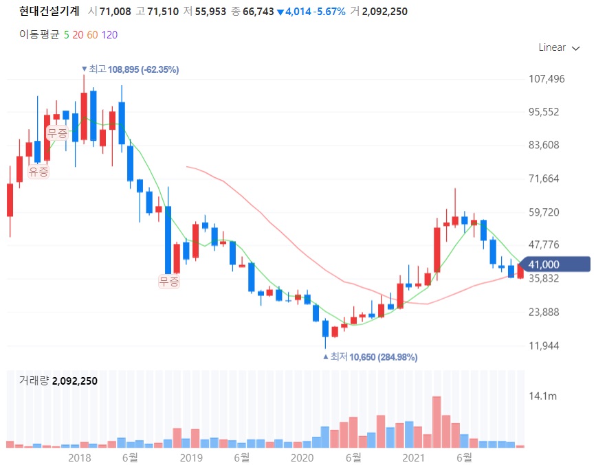 중국 굴삭기 시장 피크아웃, 헝다 이슈 등으로 투자심리 악화된 상태. 다만 선진국시장의 인프라 투자 반영 및 인도시장 회복 등이 실적을 방어해 줄 것으로 기대. 또한 중간지주인 현대제뉴인을 통해 현대건설기계와 현대두산인프라코어의 사업 및 지배구조를 변화시켜 시너지를 창출할 것으로 기대. 투자의견 매수를 유지하며, 목표주가는 58,000원으로 하향(기존 82,000원). 목표주가는 과거 4개년 PER, PBR, EV/EBITDA 평균에서 최저 배수로 변경 적용해 산출.
