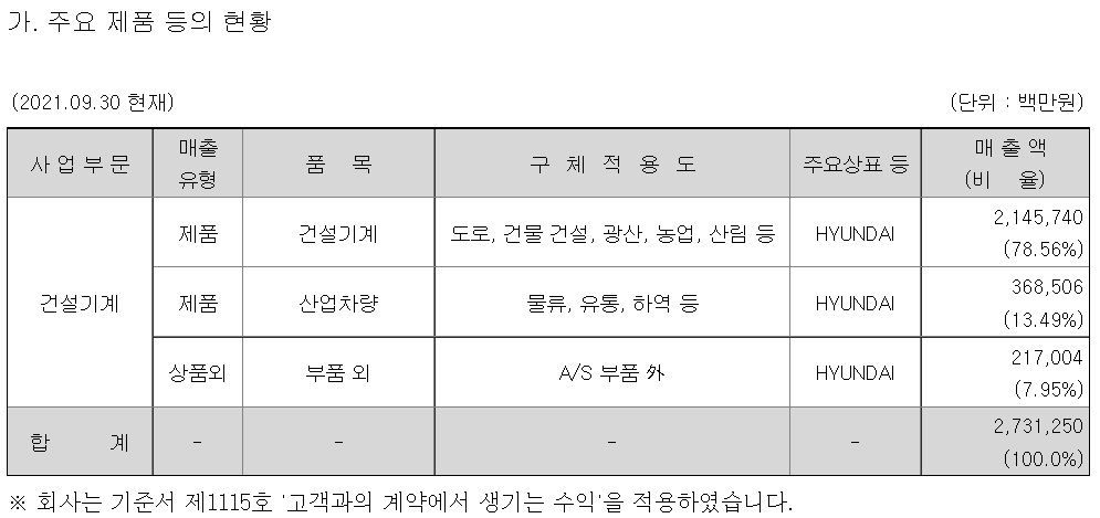 [현대건설기계] 기업개요 동사는 인적분할하여 설립된 신설회사로 2017년 5월 재상장하였으며, 분할 전 회사인 현대중공업의 건설장비사업부문을 영위하고 있음.