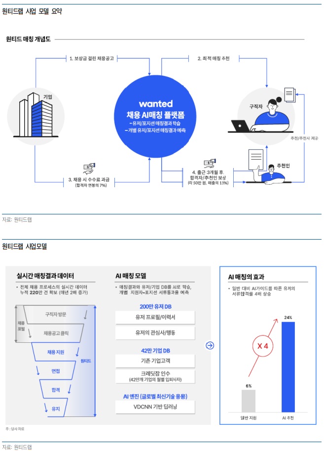 원티드랩의 핵심경쟁력은, 1) AI 매칭 엔진: 일반 대비 AI가이드 유저의 서류합격률 4배 상승, 이에 따른 채용 비용/소요시간 크게 감축, 2) 누적 DB: 유저 DB 200만, 기업 DB 42만 보유, 3) 매칭채용 선점: IT 직군 경쟁력 바탕으로 전직군 확대, 유관 비즈니스(채용/커리어/프리랜서 매칭, HR 솔루션, 해외진출 등) 확장에 유리.