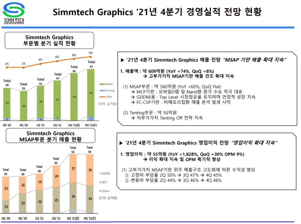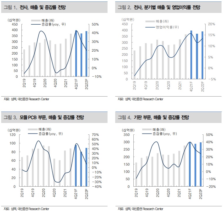 - 2021년 4분기 영업이익(연결)은 619억원으로 22.8%(qoq/ 320% yoy) 증가, 종전 추정(595억원) 및 컨센서스(596억원)를 상회 전망. 매출은 3,958억원으로 8.2%(qoq/ 42% yoy) 증가 예상. MSAP 투자 이후, 고부가 제품인 FC CSP, MCP 중심의 매출 증가 및 영업이익률 개선이 2분기 연속으로 컨센서스를 상회 추정. 국내 경쟁사대비 반도체 PCB(패키지 서브스트레이트) 매출과 DDR4 등 메모리 모듈 중심으로 포트폴리오 구성이 차별화, 2021년 4분기 및 2021년 연간으로 최고의 매출, 영업이익을 전망
