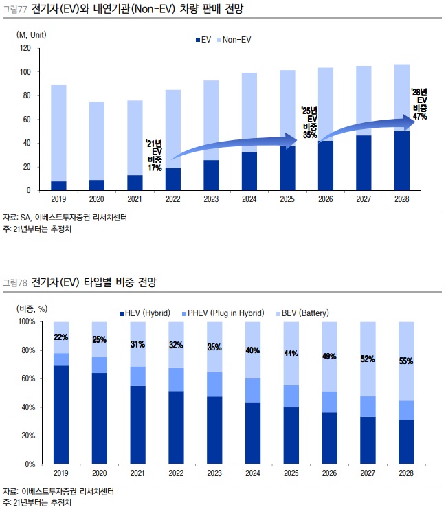 내연기관 자동차의 시장의 부진이 지속되는 반면, 전기차의 수요는 2030년경 5천만대로 성장하여 전체 자동차 시장 판매의 50% 수준에 달할 것으로 보인다. 특히 전기차 시장 내에서도 BEV로의 전환이 가속화되며 친환경규제에 적극적으로 대응해나갈 것으로 예상된다. 또한 완성차 OEM과 배터리 제조사들의 대규모 투자와 각국 정부의 보조금 정책으로 인해 시장의 예상보다 더 가파르게 기존 내연기관 자동차 시장을 대체해 나갈 것으로 기대한다.