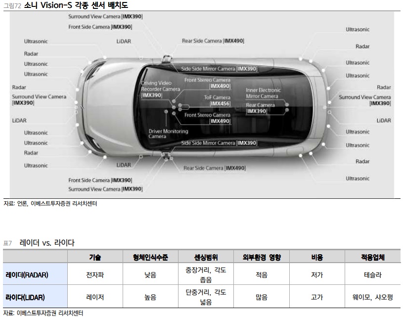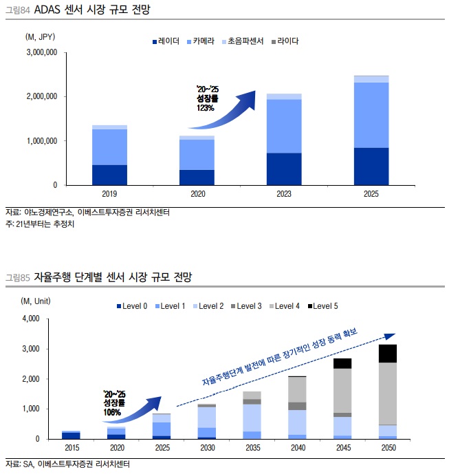 특히 자율주행차에 탑재되는 센서의 탑재 수량 및 기술의 고도화는 지속적으로 확대해나갈 것이며, 특히 차량용 카메라 관련 이미지 센서 및 모듈의 경우 3D Sensing 채용확대 등 고도화된 기술의 도입을 통해 성장세가 확대될 것으로 전망된다.