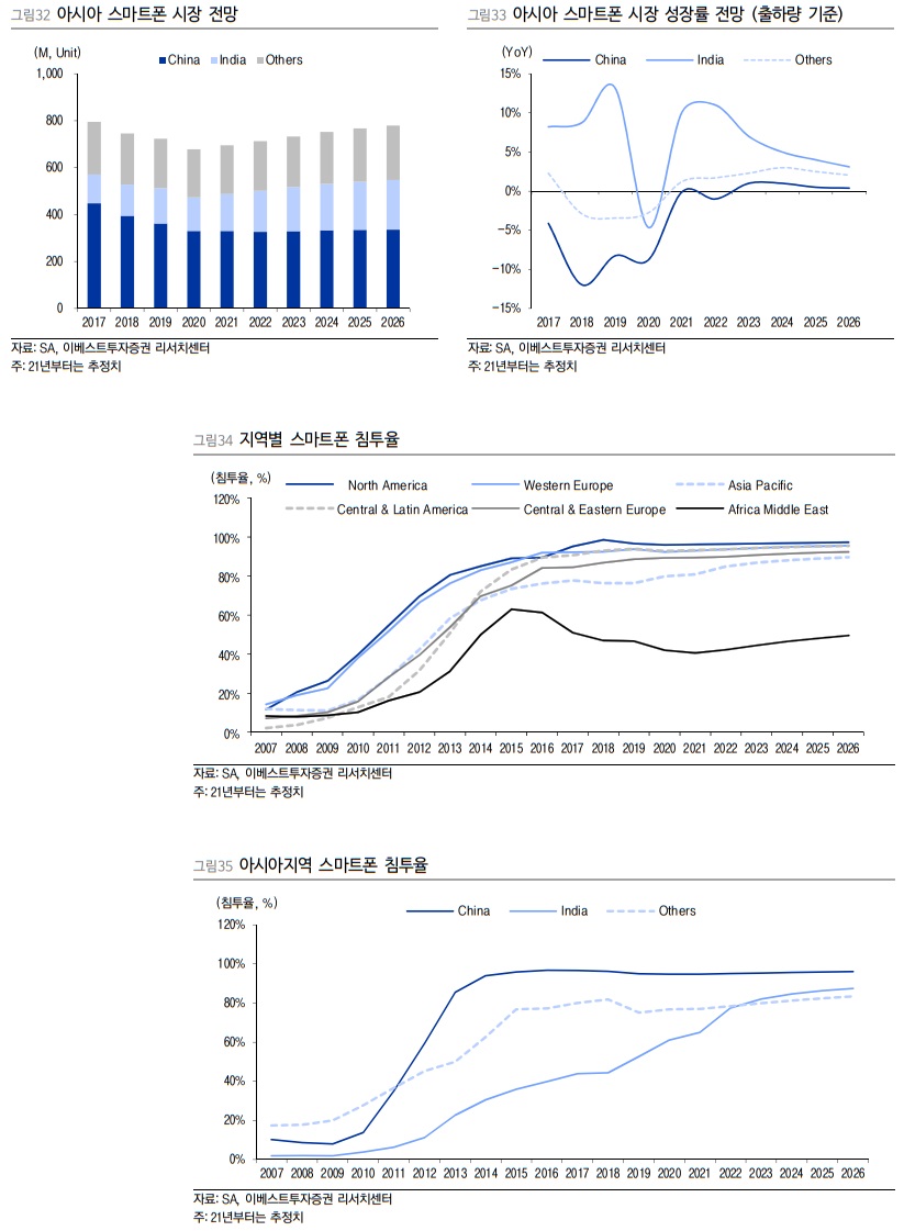 지역별 전망 : 기댈 곳도 얼마 없고, 경쟁은 지속 심화된다 주요 시장인 북미, 서유럽, 중국 및 주요 선진국들의 스마트폰 침투율은 이미 90% 중반을 넘어섰을 만큼 시장이 포화된 상태로 성장 둔화 트렌드는 지속될 것으로 보인다. 다만 여전히 침투율이 낮은 인도(65%), 아프리카(41%)와 같은 신흥국 중심의 성장세는 유효하며 수량 기준 글로벌 스마트폰 시장을 이끌어 나갈 것으로 전망된다. 가장 규모가 큰 시장인 중국과 성장성이 가장 높은 인도 시장을 통해 시장 동향을 살펴볼 필요가 있다.