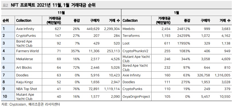 또한, 3개월 남짓한 짧은 기간 사이 거래대금 상위 프로젝트 순위가 완전히 뒤바뀌었다. Axie infinity와 같은 게임성 NFT들의 순위는 하락했고, 그 자리를 대부분 CryptoPunks와 같은 커뮤니티 프로젝트가 차지하고 있다. 특히 1월 글로벌 거래대금 상위 3개 프로젝트의 지난 한 달간 거래대금 증가율은 20,000%(200배 증가)에 달해 유행에 민감하다는 것을 알 수 있다. 전 세계 연예/스포츠계에서 가장 저명한 NFT 프로젝트인 NBA Topshot은 지난 10월 글로벌 거래대금 9위를 기록했으나, 1월 기준 차트 아웃되었다.