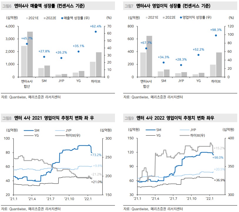 특히 성장주에 불리한 시장 환경은 단기적으로 큰 하락폭에도 불구하고 엔터 산업에 대한 투자 확대를 망설이게 한다. 지난 2년간 실적 성장과 더불어 밸류에이션 확장을 통해 주가 상승폭을 키웠던 엔터 산업에 대한 고민도 커지는 구간이다. 밸류에이션이 유지된다는 가정 하에 적정 가치에 대한 논의는 결국 실적으로 귀결된다. 투자자들의 다음 질문은 ‘2022년 엔터 업체들의 실적을 얼마나 신뢰할 수 있느냐’다. 지난 2개월이 NFT로 부풀었던 밸류에이션을 토해내는 과정이라면 앞으로 진행될 과정은 2022년 실적에 대한 눈높이를 현실화하는 기간이 예상된다.