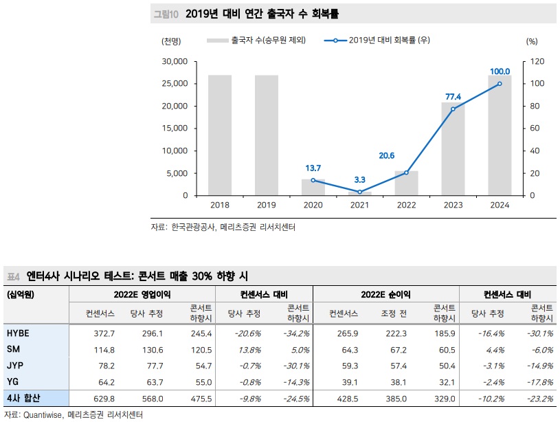 현재 당사의 엔터 4사 추정치는 2022년 콘서트 완전 재개를 가정한 수치다. 하이브를 제외하면 코스닥 엔터 3사의 당사 추정치는 시장과 유사한 수준이다. 2022년 및 2023년 당사의 출국자 회복 추정치는 2019년 대비 각각 21%, 72% 수준이다. 이는 오미크론 여파로 재개 시점을 현실화 한 수치인데, 이를 반영할 경우 콘서트 재개 시기 또한 조정이 필요하다.