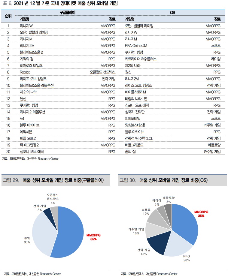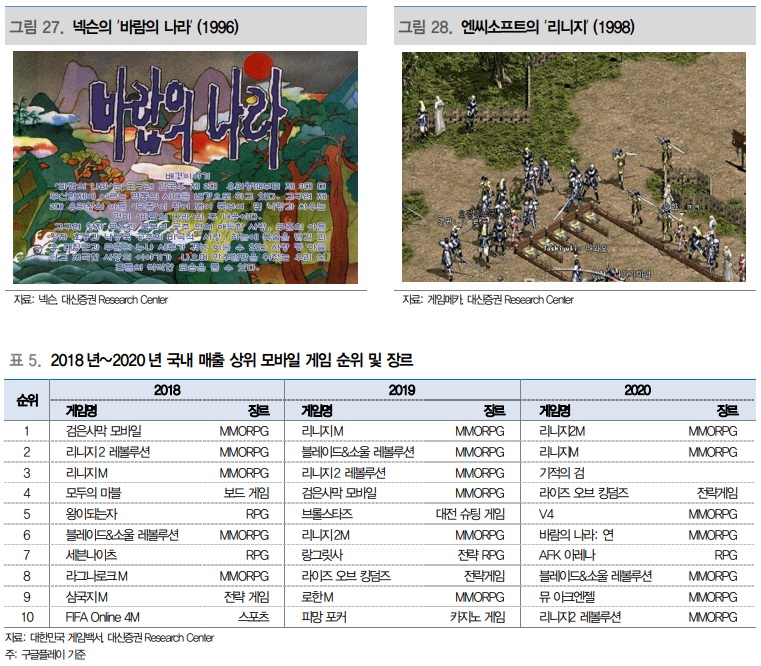 한국 PC 게임의 시작이자, 2000년대 PC 게임의 전성기의 포문을 연 것은 1990년대에 출시한 넥슨의 ‘바람의 나라’와 엔씨소프트의 ‘리니지’다. 두 게임의 장르는 모두 MMORPG다. 한국 게임 시장은 MMORPG 장르의 인기가 압도적으로 높은 시장이며, 모바일 게임 시장의 규모가 PC 게임 시장의 규모를 넘어선 지금까지도 여전히 MMOPRG 장르가 주류다. 2018년부터 2022년 현재까지도 국내 매출 상위 20개 모바일 게임에는 MMORPG 비중이 높다. 모바일인덱스에 공개된, 2021년 12월 기준 모바일 양대 마켓 매출 상위 3개에 포진해 있는 카카오게임즈의 ‘오딘: 발할라 라이징’, 엔씨소프트의 ‘리니지W’과 ‘리니지M’은 모두 MMORPG 장르다.