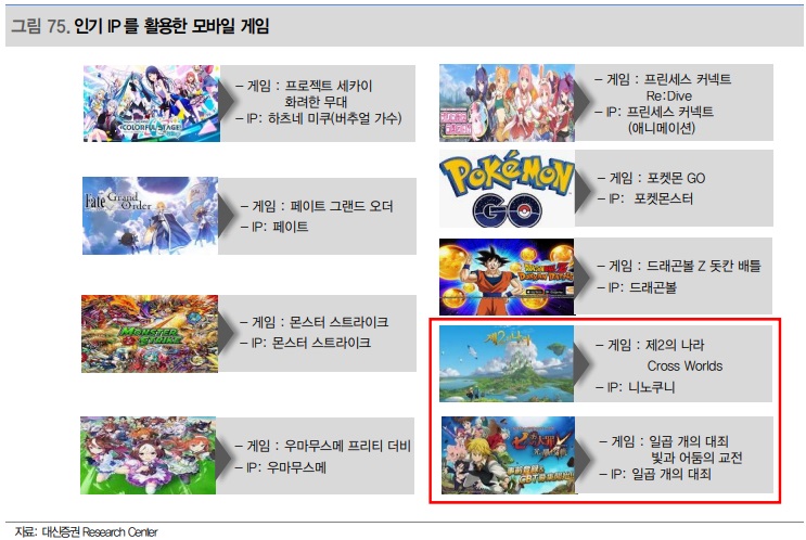 지난 10월 기준 모바일 게임 매출 상위 50개 중 한국 게임으로는 넷마블의 ‘일곱 개의 대죄 빛과 어둠의 교전: 흑백’과 제2의 나라: Cross Worlds’가 유일하다. 두 게임 모두 일본에서 이미 인기 있는 IP인 ‘일곱 개의 대죄’와 ‘니노쿠니’를 활용한 게임이다.