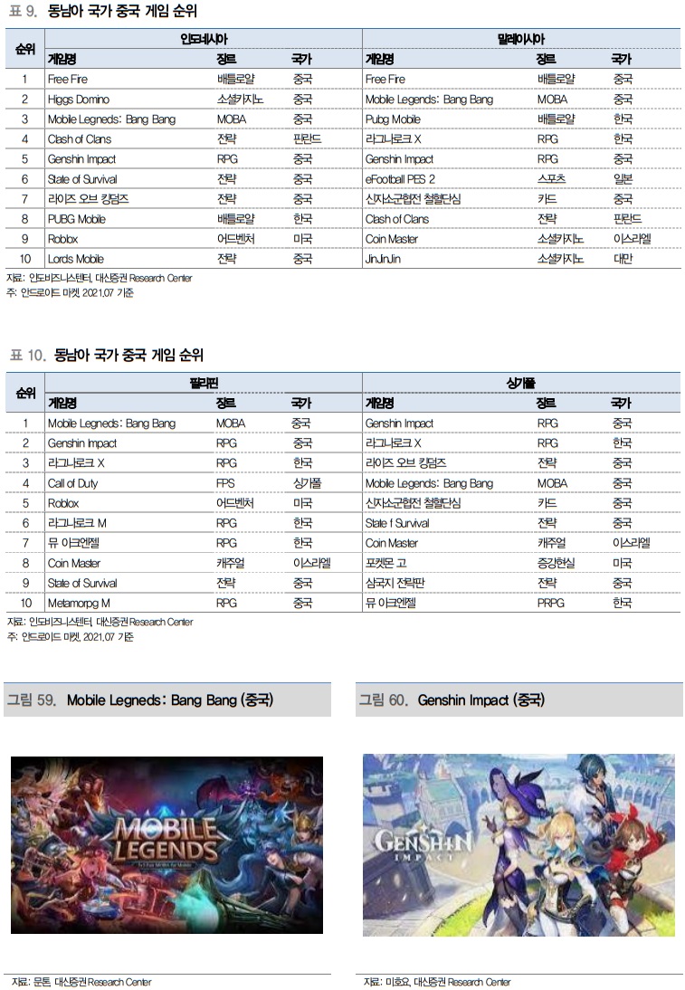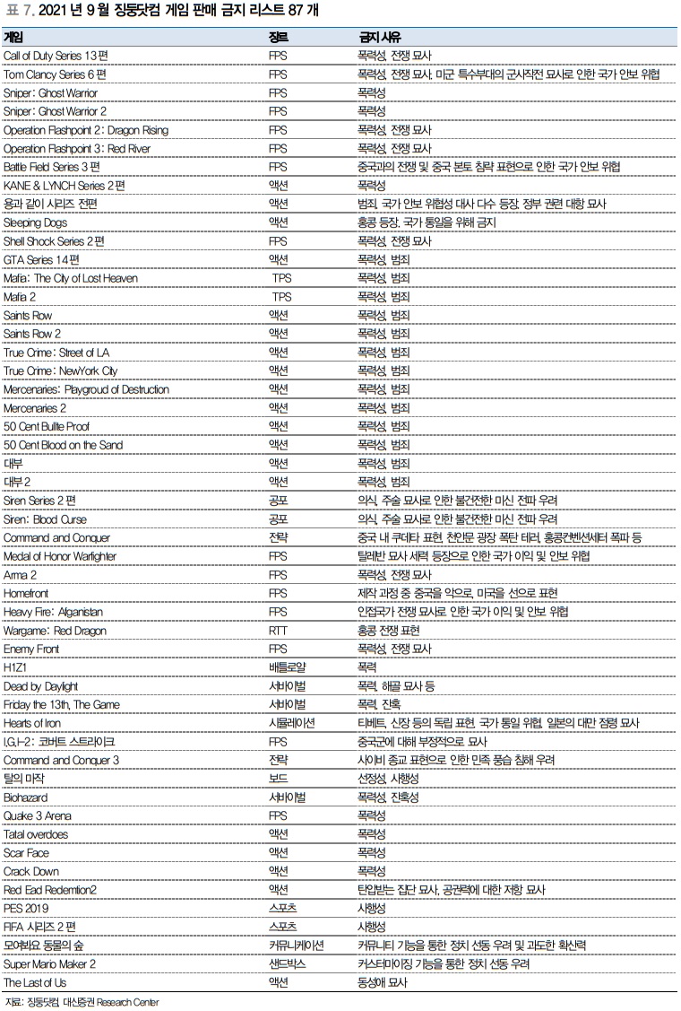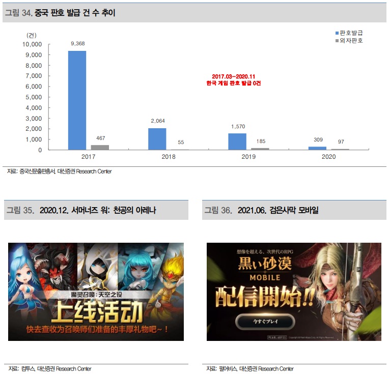 신작에 대한 판호 발급뿐만 아니라 중국의 자국 게임을 포함한 게임 산업 자체에 대한 규제가 심하다 보니, 국내 게임사들의 중국 출시와 서비스는 어려울 것으로 판단한다.