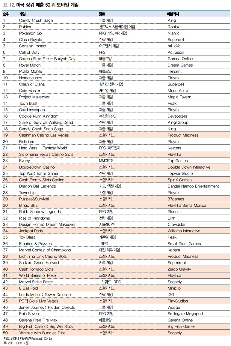 선호되는 모바일 게임 장르는 특정 장르가 독식하지 않고, 여러 장르가 플레이된다. 앱애니에 따르면, 2021년 10월 기준 앱스토어 매출 상위 100위에 하이퍼캐주얼 게임, 퍼즐 게임, AR 게임, 어드벤처, 카지노 게임 등이 고르게 분포하고 있다. 그중에서도 소셜카지노 게임은 상위 매출 50개 중 20% 이상을 차지해, 미국에서 소셜카지노 게임의 인기가 높다는 것을 알 수 있다. 코로나 영향으로 라스베가스와 같은 오프라인 카지노 영업장이 폐쇄되면서, 그 수요가 모바일로 넘어왔고 이에 따라 소셜카지노 게임 시장은 더욱 가파르게 성장세를 이어가고 있다. 미국은 소셜카지노 게임에 대한 규제가 한국처럼 까다롭지 않다. 사행성 규제도 없을 뿐더러, 게임 중독 관련해서도 스스로가 게임 시간을 조절할 수 있는 자율 규제를 적용하고 있는 만큼 소셜카지노 게임에 대해 관대하다. 소셜카지노 게임의 주요 수입원은 게임 안에서 이용하는 코인 판매이며, 특징은 게임의 라이프 사이클이 길기 때문에 게임사 입장에서는 한 번의 게임 출시로 캐시카우 역할을 할 수 있다.