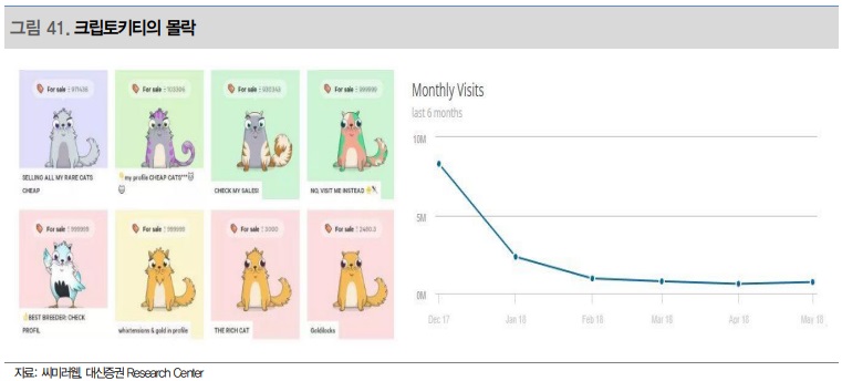 앞서 2017년에 출시됐던 이더리움 블록체인에 기반한 NFT 게임인 ‘크립토키티’를 떠올려보면 쉽게 이해할 수 있다. 2017년 11월 출시 이후 한 달만에 크립토키티의 거래 규모는 약 112억원에 달했고, DAU는 13,000명 이었다. 그러나 유저들은 빠르게 흥미를 잃었고, 바로 다음 달인 2018년 1월 DAU는 100명으로 감소했으며, 한 때 30만 달러를 호가했던 크립토키티 한 마리당 가격은 2018년 6월 기준 60달러 수준으로 떨어졌다. 남아있는 유저들은 손실을 봤다. NFT가 계속 그 가치를 유지하려면 희소성의 스토리가 오래 지속되어야 한다.