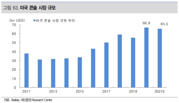 미국 게임 시장을 다른 지역과 구분 짓는 큰 특징 중 하나는 콘솔 시장의 큰 비중이다. 미국은 1990년대 콘솔 게임을 기반으로 일찍이 게임 산업을 발전시켰다. 그 때문에 글로벌 게임 시장에서는 이미 모바일 게임 시장이 타 플랫폼 게임 시장의 규모를 추월했지만, 미국은 콘솔 시장의 규모가 여전히 크다. 특히 코로나를 겪으면서, 콘솔 시장은 더욱 성장했다. 시장 조사 업체 Statista에 따르면, 2020년 미국 콘솔 시장 규모는 약 670억 달러였으며 전년 대비 약 20% 성장했다. 향후 성장 속도는 2020년 높았던 성장률의 기저효과 대비 둔화되겠지만, 콘솔에 대한 수요는 지속적으로 존재할 것이며, 콘솔 시장 규모는 유지될 것으로 전망한다.