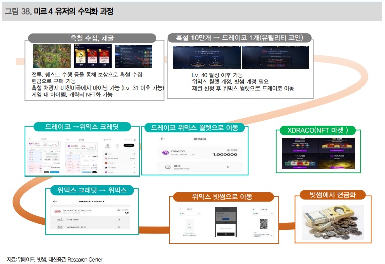 게임사들은 게임 유저들이 1) 게임 재화를 암호화 화폐로 전환 시, 그리고 2) NFT를 거래할 때마다 수수료를 받는다. 예를 들어, Axie Infinity의 경우, Axie라는 NFT화된 펫이 거래될 때마다, 개발사 Sky Mavis는 거래 규모의 4.25%에 해당하는 수수료를 받는다. 위메이드의 미르4의 경우, P2E와 NFT 요소가 모두 도입된 게임으로 두 가지의 수수료 매출이 발생한다. 게임의 유틸리티 코인인 드레이코를 암호화 화폐 위믹스로 전환할 때 발생하는 거래금액의 환전 수수료 0.9%와 NFT 아이템 거래 시 거래대금의 수수료 5%를 수취한다. 즉, 해당 게임을 즐기는 유저 수와 거래 규모가 많을수록 그 게임사는 수익을 얻게 되는 구조다.