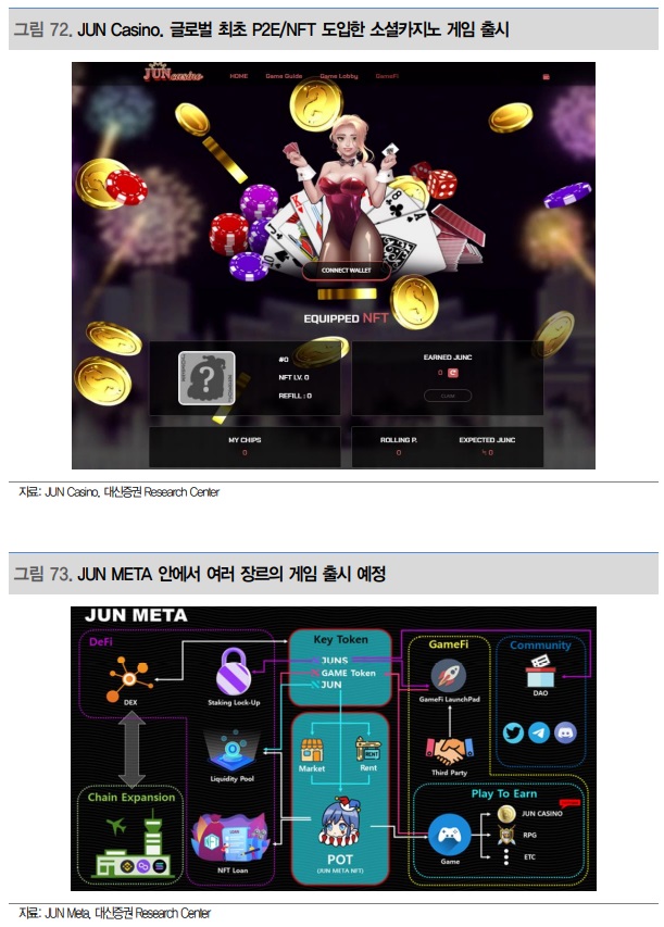 1월 20일 글로벌 최초로 소셜카지노 게임에 NFT/P2E를 도입한 게임인 ‘JUN Casino’가 출시됐다. 게임의 진행 방식은 ‘준 토큰(기축통화)’을 가지고 NFT를 발행하면서 시작된다. 각 유저가 발행한 NFT는 카지노 게임을 플레이하기 위한 충전 카드 역할을 한다. 각자 보유한 NFT 등급을 올릴수록 카지노 게임에 필요한 칩을 더 많이 충전할 수 있다. 이후 카지노 게임을 통해 얻은 게임 토큰은 스왑을 통해 수익화할 수 있다.
